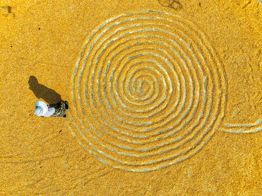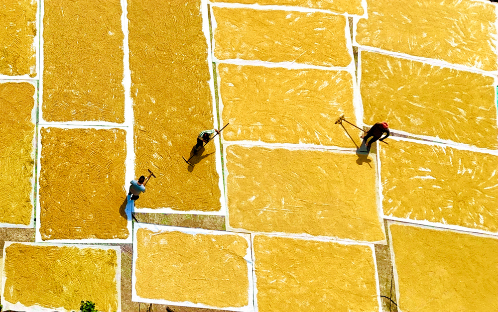 ↑2025年9月13日,农民在贵州省黔东南苗族侗族自治州从江县东朗镇摆啊村翻晒稻谷。(无人机照片)CICPHOTO/樊绍光 摄