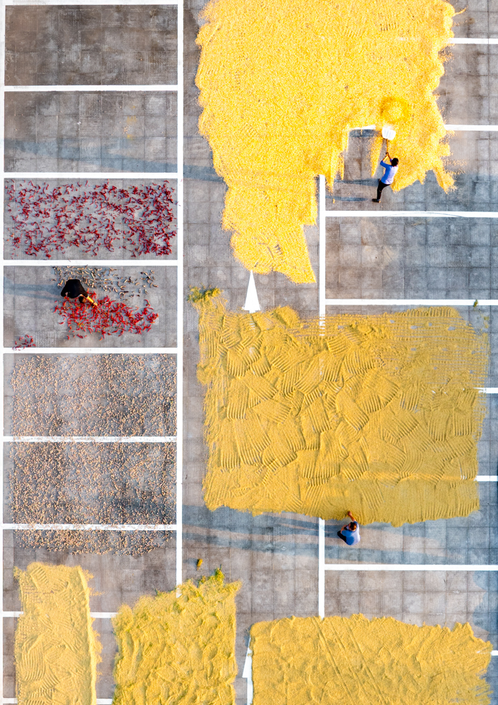 ↑2025年9月7日,农民在重庆市南川区黎香湖镇西湖村晾晒稻谷、玉米、花生、红辣椒等农作物。(无人机照片)CICPHOTO/罗川 摄