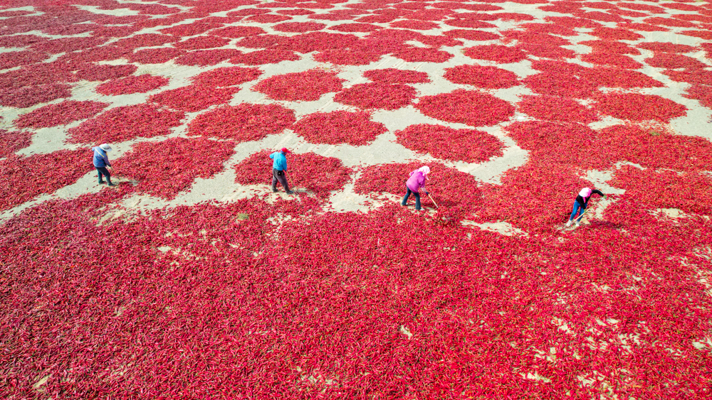 ↑2025年9月20日,农民在甘肃省酒泉市肃州区三墩镇晾晒红辣椒。(无人机照片)CICPHOTO/曹红祖 摄