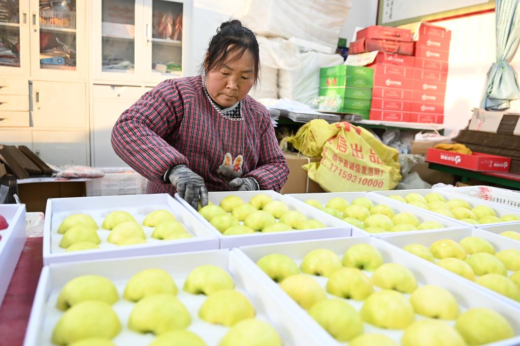 在陕西省渭南市白水县秋林苹果专业合作社,工人打包装箱“瑞雪”苹果(2025年1月9日摄)。