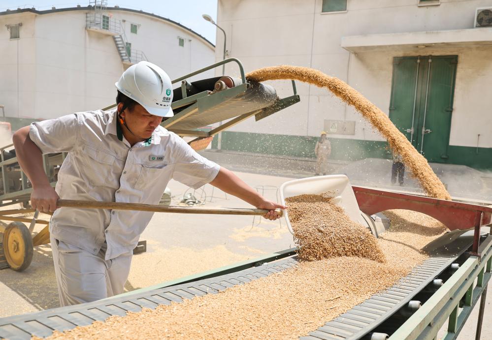 在江苏连云港市连云区的中央储备粮连云港直属库粮食收购作业区,工作人员用传输机传送小麦入库(2025年6月18日摄)。