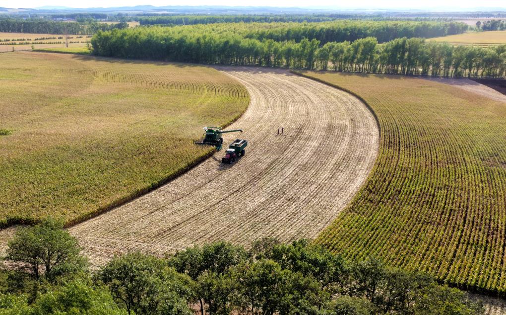 在黑龙江北大荒农业股份有限公司友谊分公司第七管理区,大型收获机车在收获玉米(2025年9月18日摄,无人机照片)。