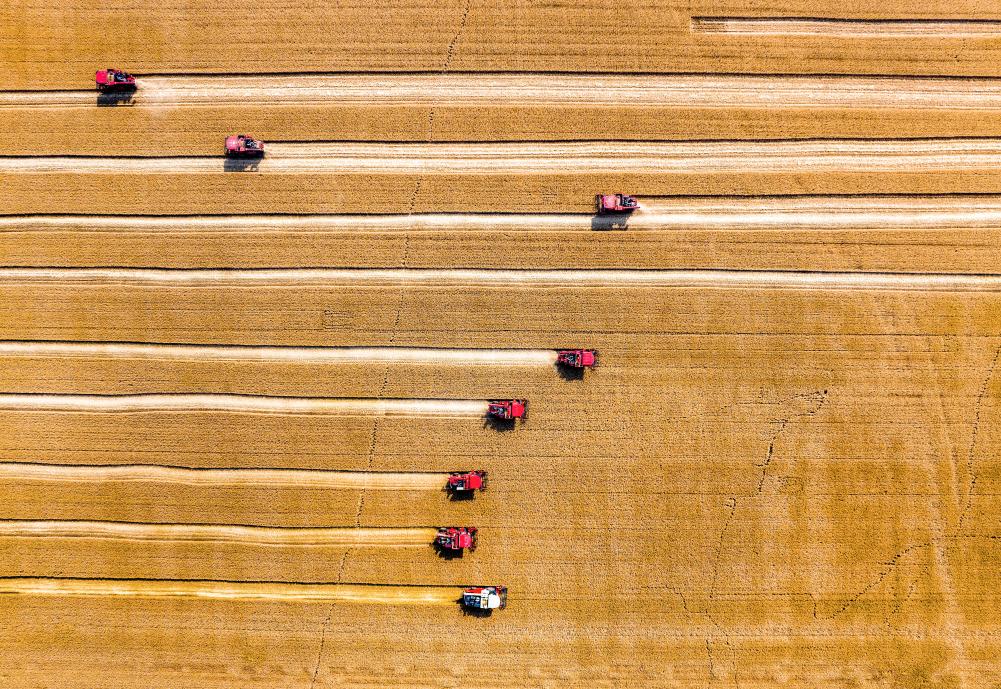 联合收割机在山西省运城市盐湖区解州镇曲村麦田里收割小麦(2025年5月28日摄)。