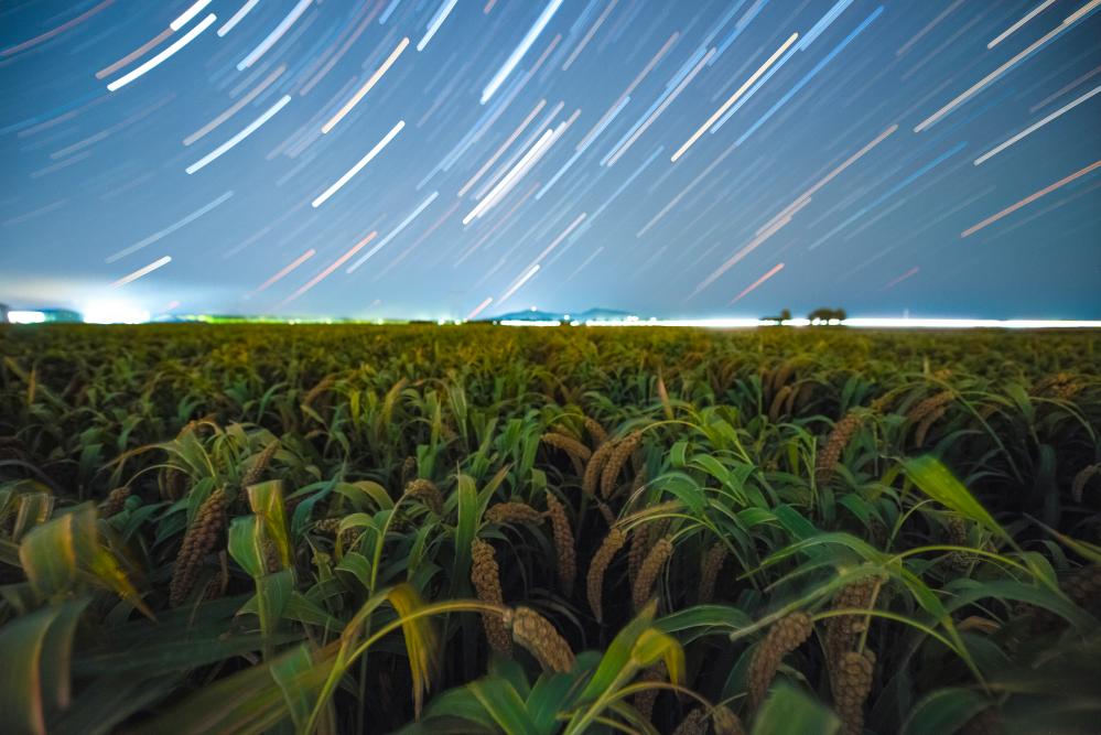 在黑龙江省佳木斯市富锦市拍摄的星空下的谷子(2025年9月17日摄,堆栈合成照片)。
