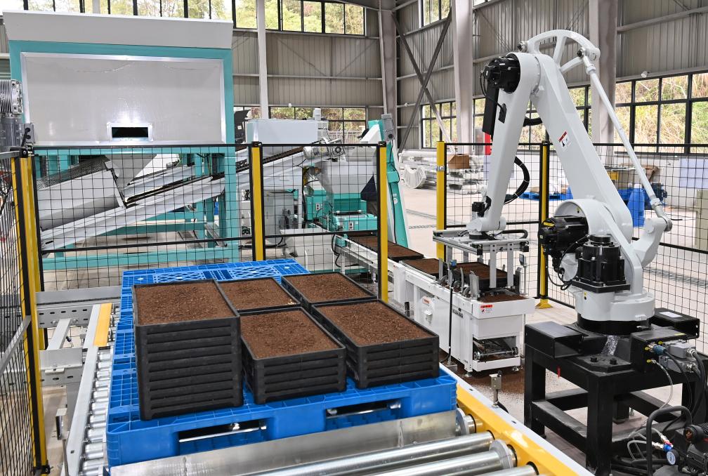 在浙江省东阳市皇野生态农业有限公司现代农事服务中心,全自动智能水稻育秧生产线在制作秧盘(2025年3月13日摄)。