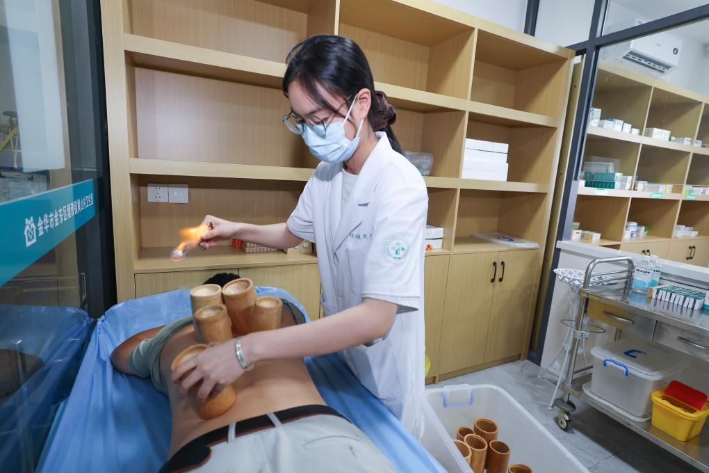9月23日,定向培养的大学生村医黄晶在金华市金东区塘雅镇横山村卫生室给村民拔火罐。塘雅镇横山村卫生室于2024年10月底建设完工,主要承担横山村1000多村民的基本公共卫生服务、基本医疗服务等。2025年通过“金东区大学生村医定向培养”项目,成功招募到了一名医学专业定向培养生黄晶,在经过为期6个月的专项培养与实习后,开始全面负责村卫生室的日常诊疗工作。