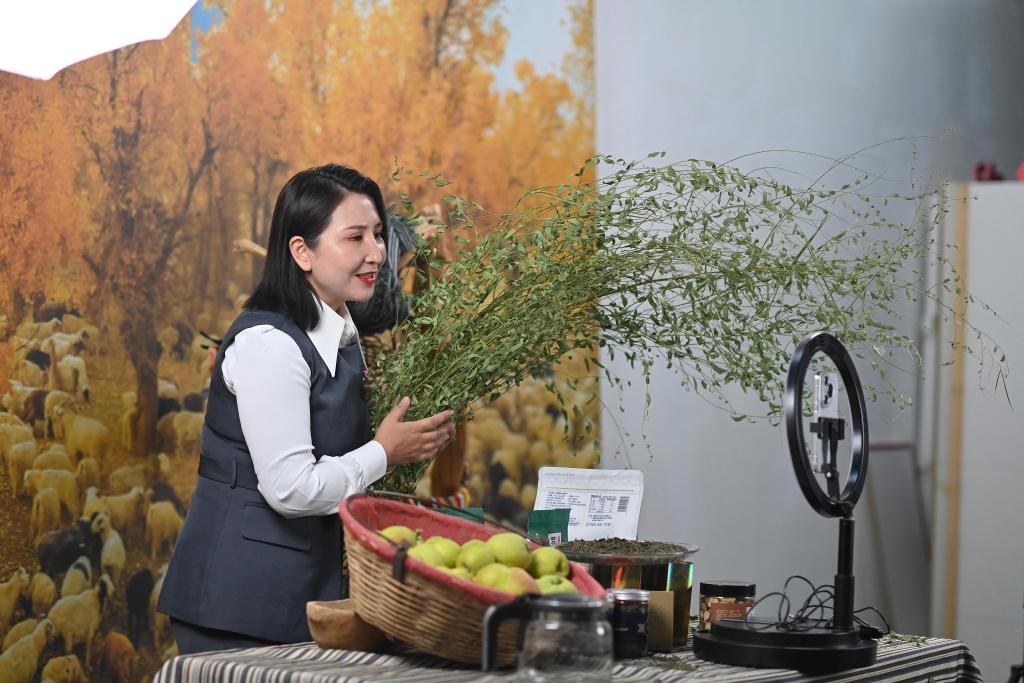 9月19日,尉犁县电商协会负责人米日阿依·阿西木在达西村的电商基地直播推介达西村农产品。近年来,达西村构建“农户生产+企业加工包装+电商销售+物流配送”全产业链,为县域经济发展培养孵化本土直播电商人才,促进传统产业转型升级。2024年