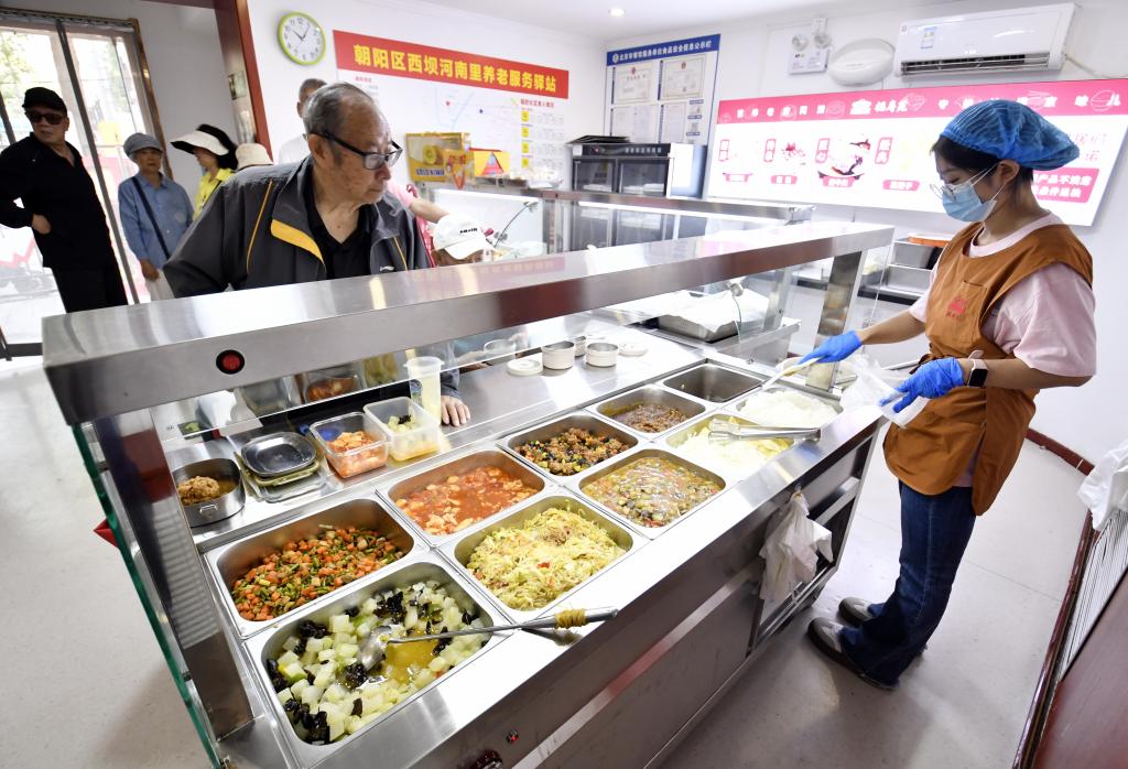 9月26日,朝阳区香河园街道的居民在老年餐厅购买午餐。