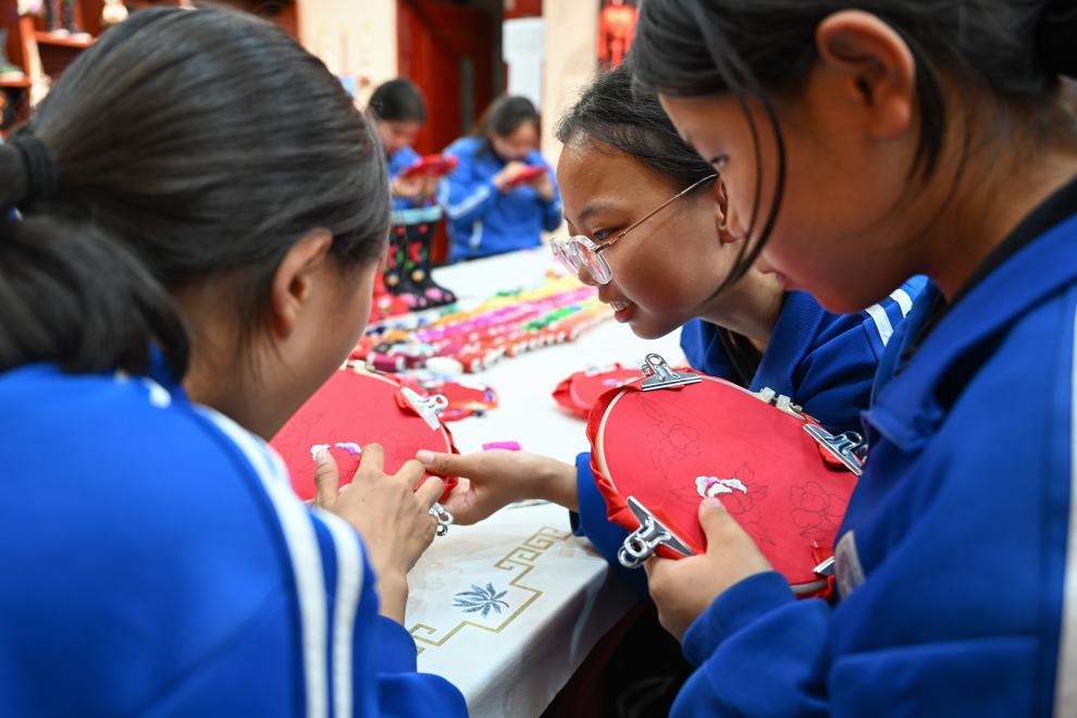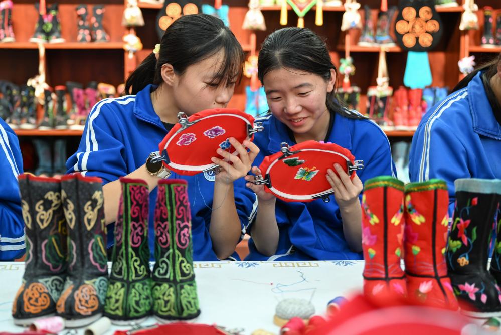 9月26日,在内蒙古兴安盟科右中旗巴彦呼舒第六中学,学生在交流刺绣技艺。