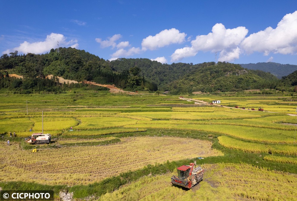 ↑2025年9月17日,农民驾驶收割机在贵州省黔东南苗族侗族自治州从江县洛香镇上皮林村收割水稻。(无人机照片)CICPHOTO/梁辉波 摄