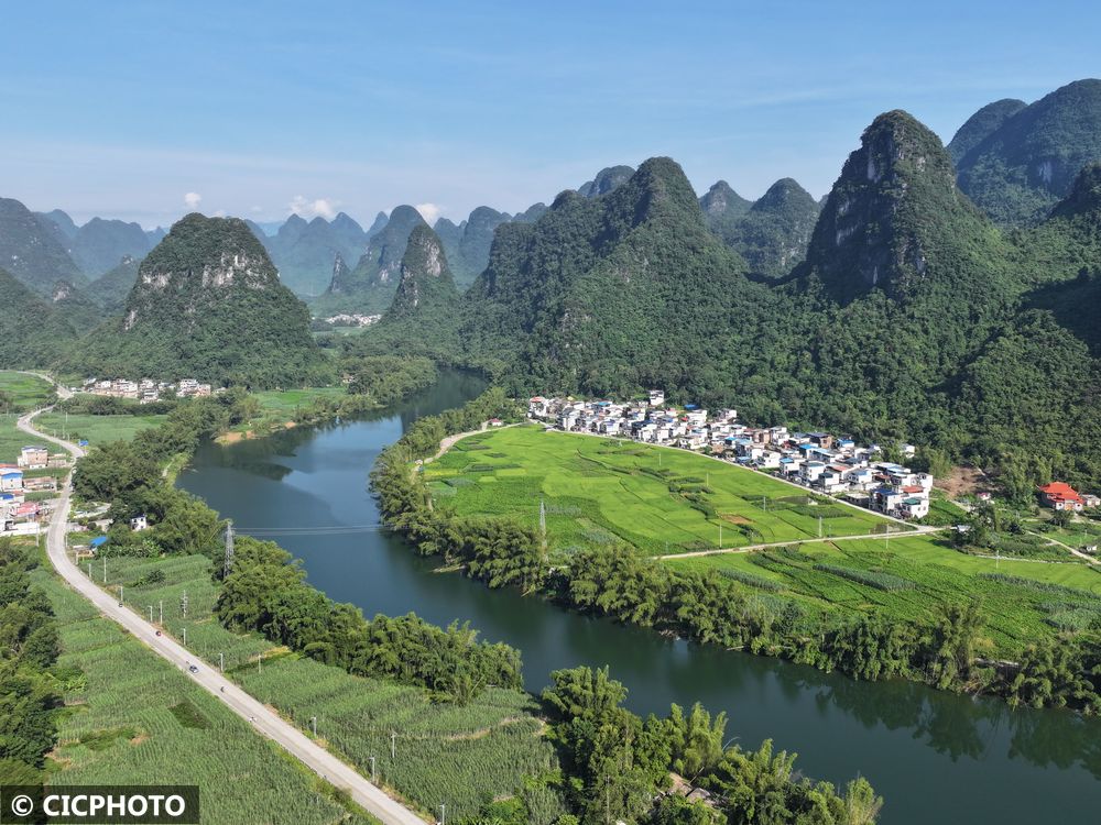 ↑2025年9月28日在广西河池市罗城仫佬族自治县怀群镇泗岸村拍摄的景色。(无人机照片)CICPHOTO/韦如代 摄