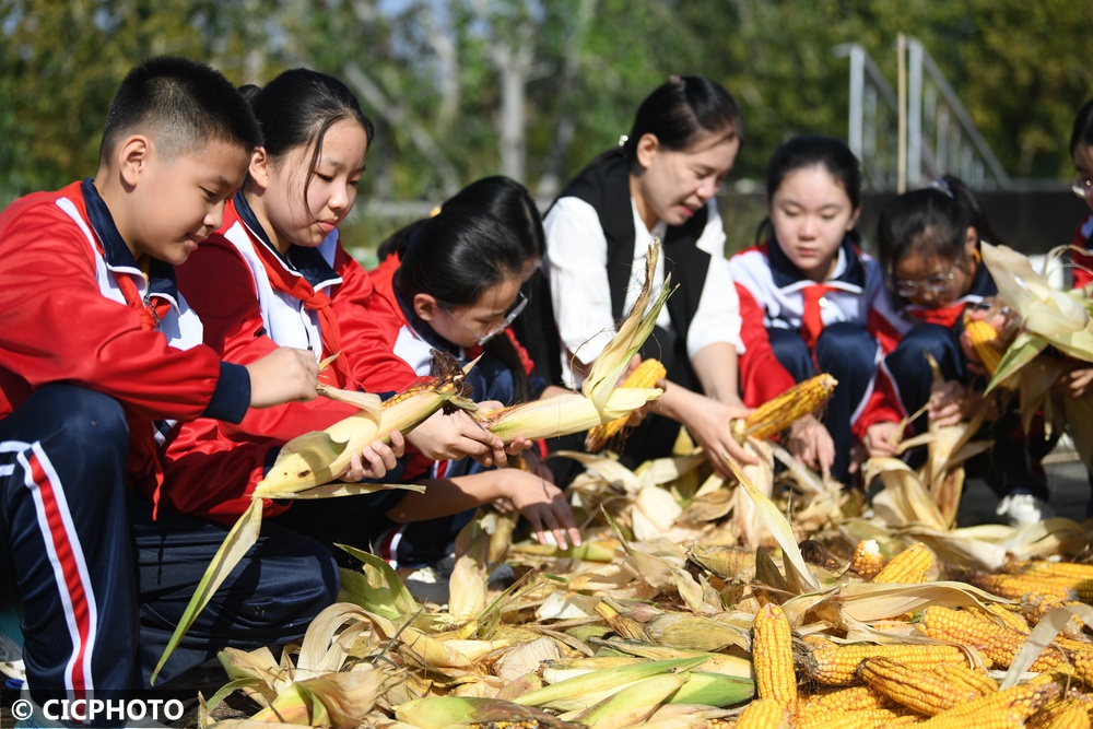 ↑2025年9月25日,河北省邯郸市广平县第一实验小学学生在“校园农场”剥玉米皮。CICPHOTO/程学虎 摄