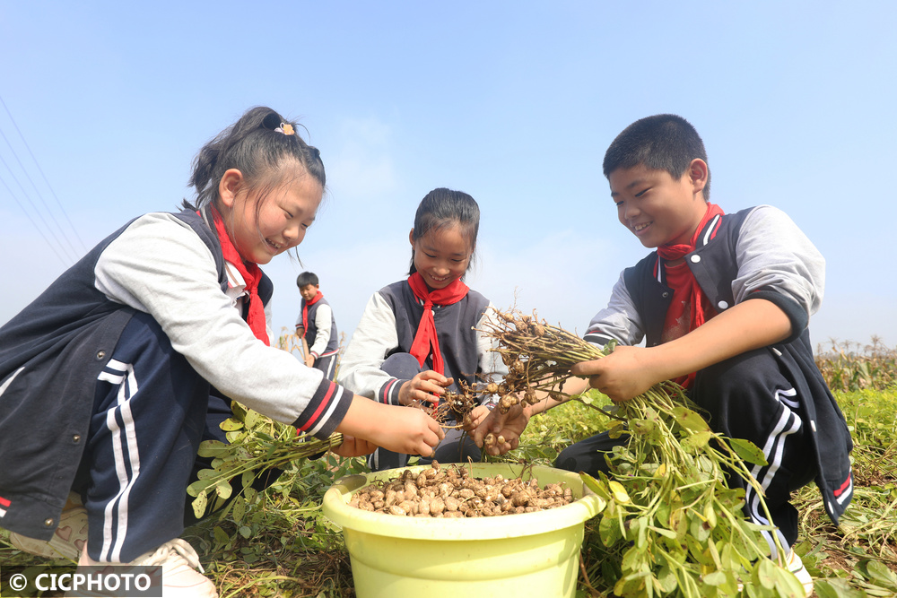 ↑2025年9月24日,河北省唐山市丰润区火石营镇东吕各庄小学学生在田间帮农民摘花生。CICPHOTO/朱大勇 摄