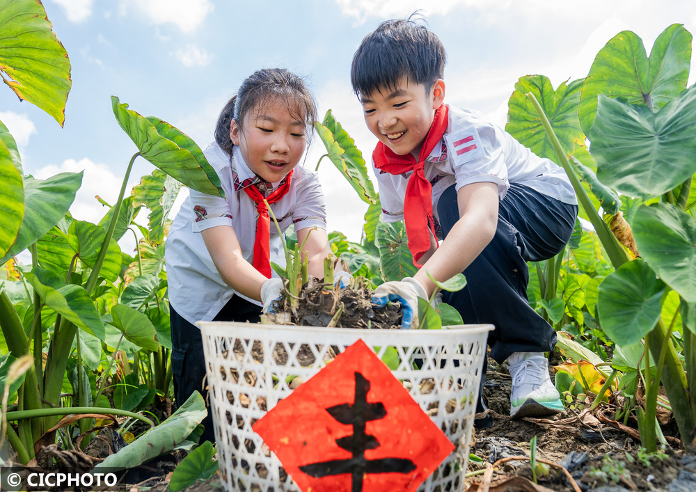 ↑2025年9月23日,江苏省海安高新区实验小学学生在海安市雅周镇许家庄村田间将采收的芋头装筐。CICPHOTO/翟伟凯 摄