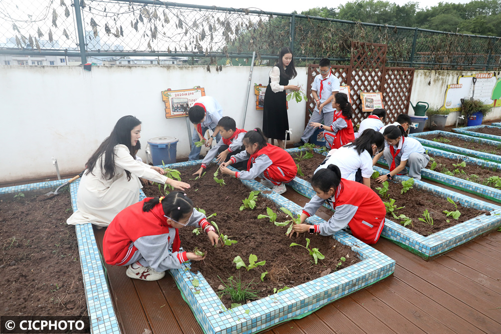 ↑2025年9月22日,四川省广安市广安区东方小学校学生在老师指导下移栽蔬菜苗。CICPHOTO/廖小兵 摄