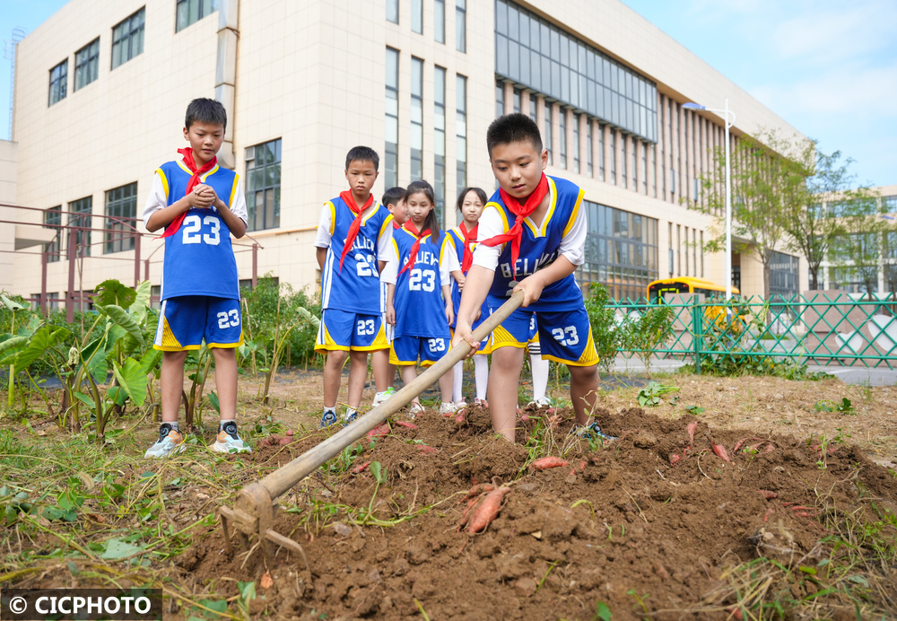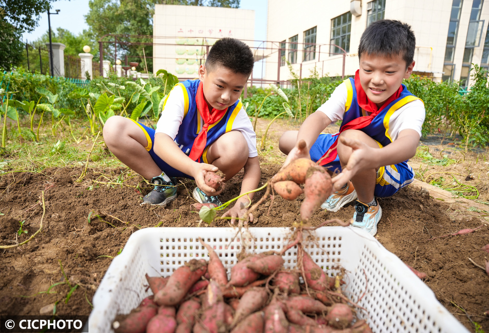 ↑2025年9月22日,浙江省湖州市长兴县第五小学学生在劳动实践基地采收红薯。CICPHOTO/陈海伟 摄