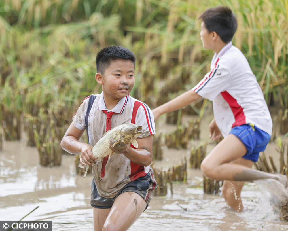 ↑2025年9月19日,贵州省黔东南苗族侗族自治州施秉县第四小学学生在校园“童心农场”的稻田里捉田鱼。CICPHOTO/磨桂宾 摄