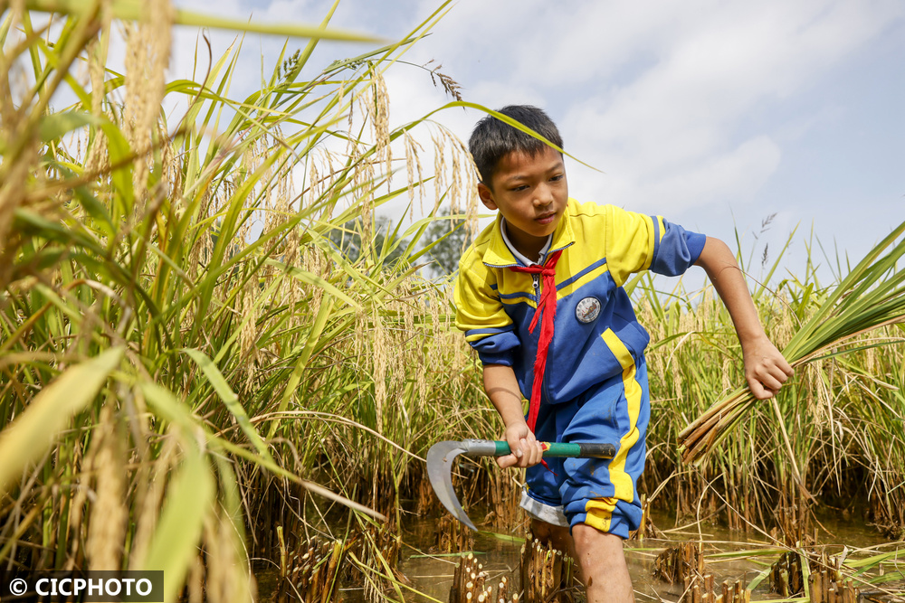 ↑2025年9月19日,贵州省黔东南苗族侗族自治州施秉县第四小学学生在校园“童心农场”的稻田里收割水稻。CICPHOTO/磨桂宾 摄
