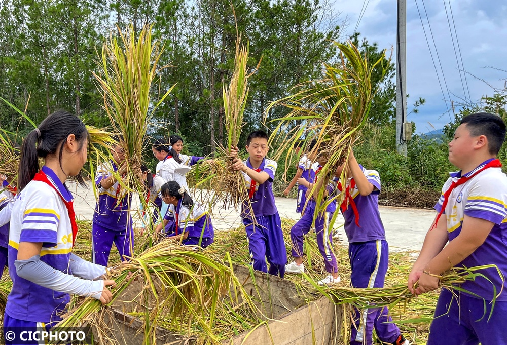 ↑2025年9月16日,四川省巴中市通江县第六小学学生在“共享稻田”旁将收割的水稻脱粒。CICPHOTO/程聪 摄