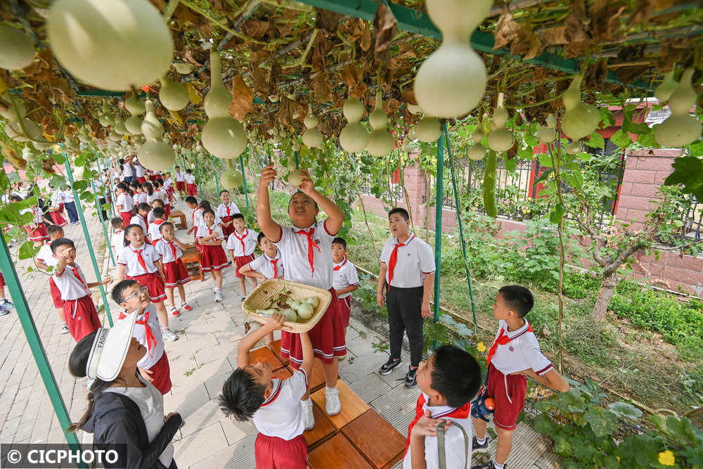 ↑2025年9月16日,山东省青州市宏远学校学生在老师指导下采摘葫芦。CICPHOTO/王继林 摄