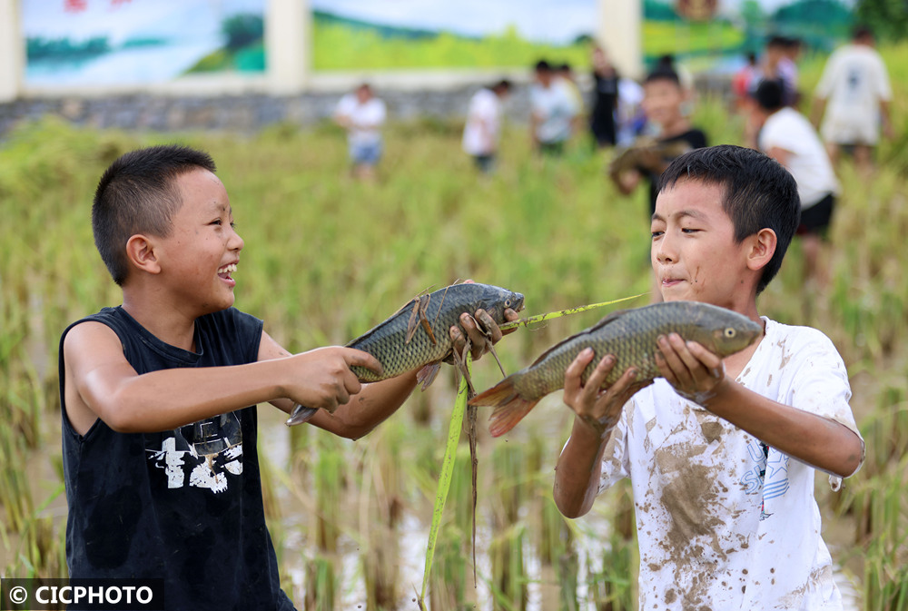 ↑2025年9月11日,贵州省遵义市正安县安场镇石井小学学生在劳动实践基地的稻田里捉稻花鱼。CICPHOTO/赵永章 摄