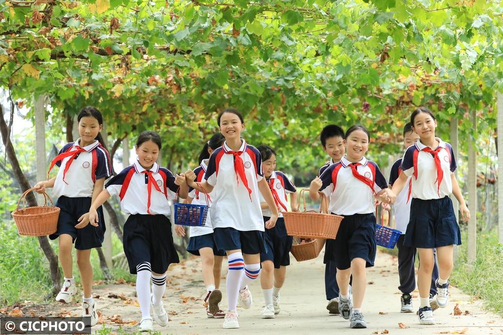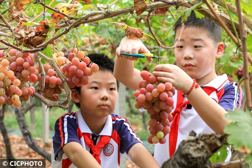↑2025年9月1日,浙江省湖州市长兴县吕山乡中心小学学生在校外劳动实践基地采摘葡萄。CICPHOTO/周洪峰 摄