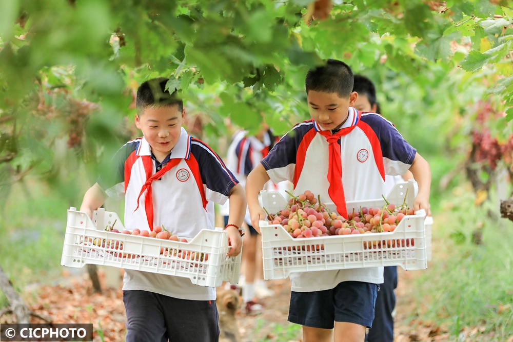 ↑2025年9月1日,浙江省湖州市长兴县吕山乡中心小学学生在校外劳动实践基地搬运刚采摘的葡萄。CICPHOTO/周洪峰 摄