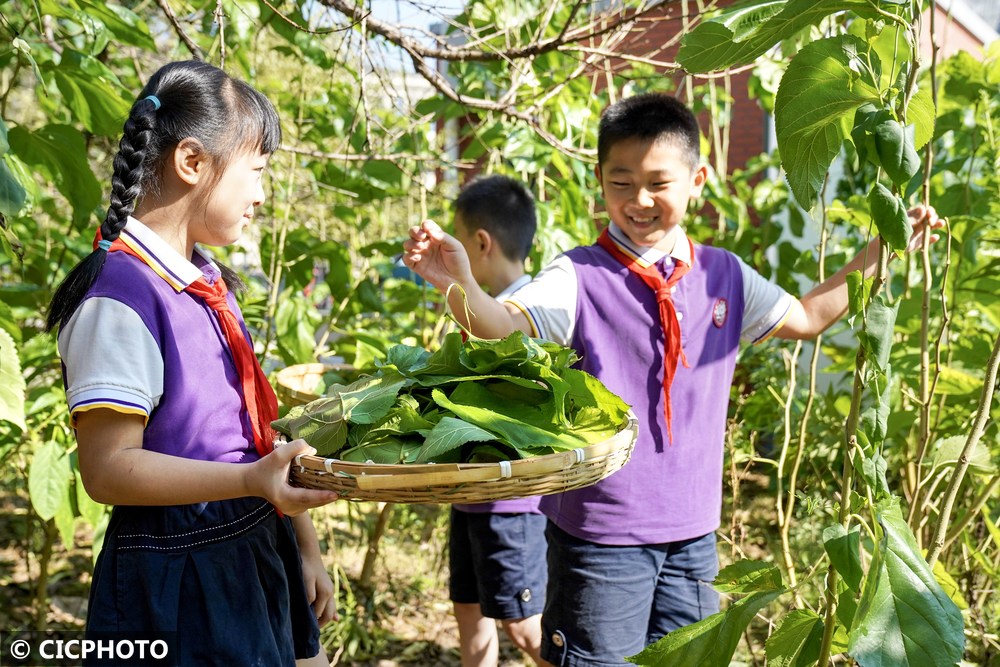 ↑2025年9月15日,浙江省湖州市安吉县紫梅小学学生在校内的“蚕桑园”采桑叶。CICPHOTO/潘学康 摄