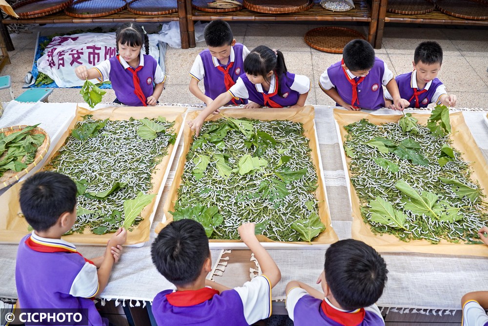 ↑2025年9月15日,浙江省湖州市安吉县紫梅小学学生在“水驿蚕桑”课堂上给蚕宝宝喂食桑叶。CICPHOTO/潘学康 摄