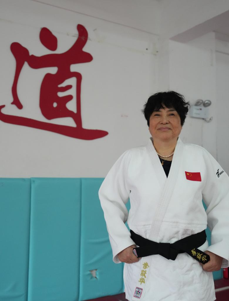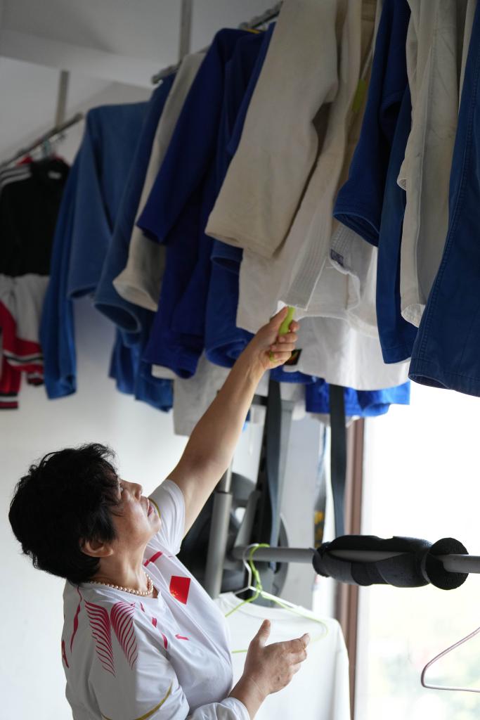 10月9日,李跃华在长沙市超辉残疾人体育训练培训中心为盲人柔道运动员晾晒洗干净的道服。