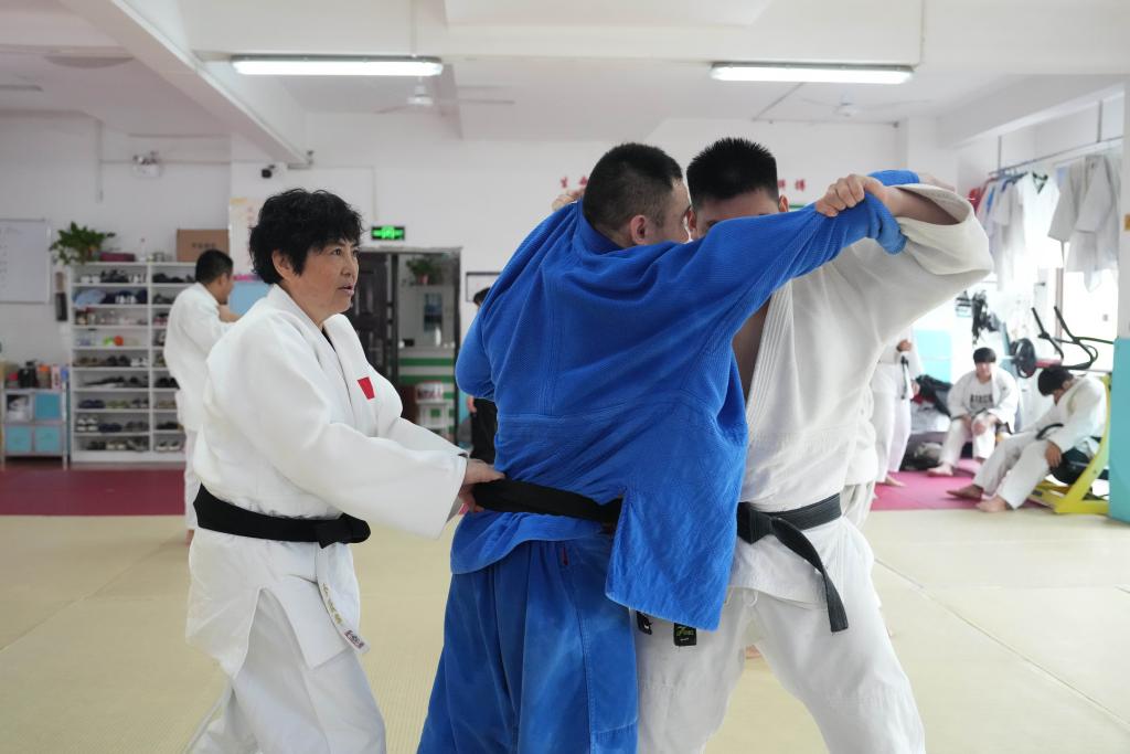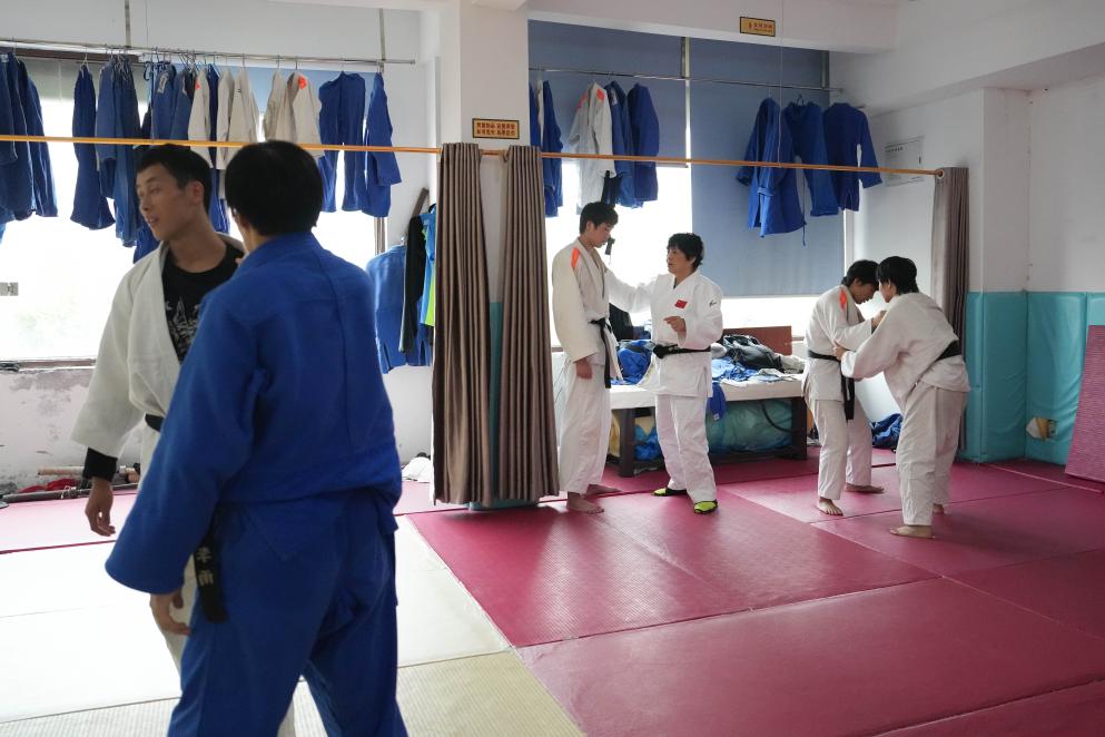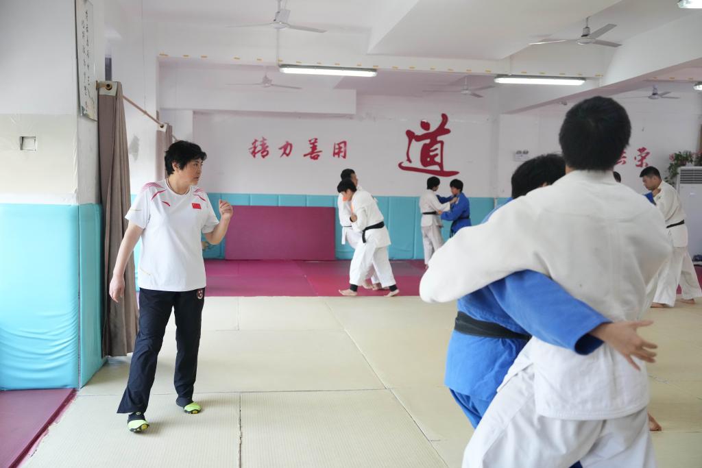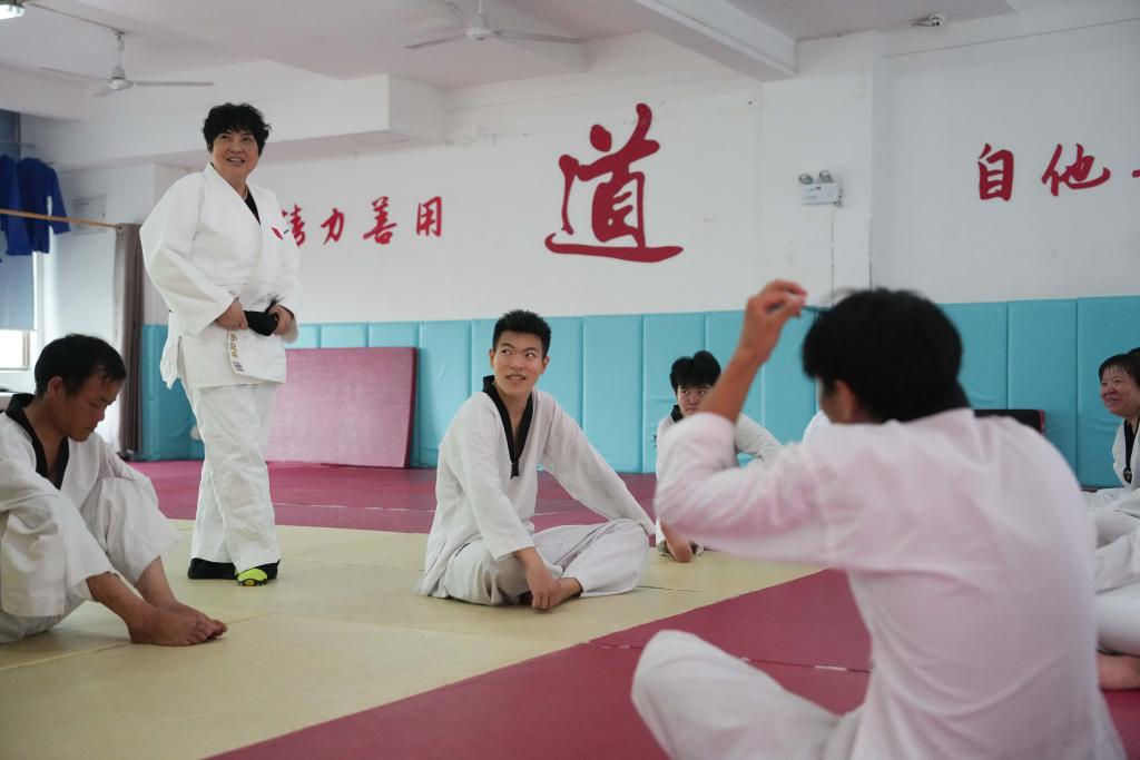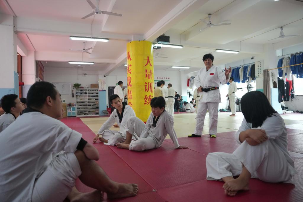 10月8日,李跃华(前左一)在长沙市超辉残疾人体育训练培训中心指导柔道运动员。