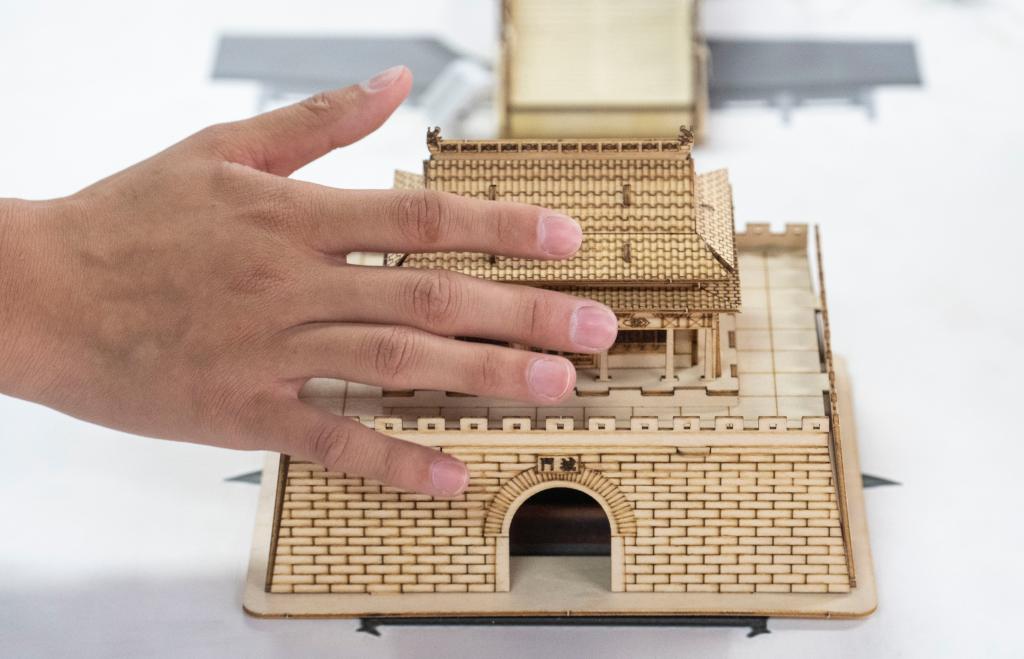 10月13日,视障人士在发布会后,触摸北京中轴线建筑模型。