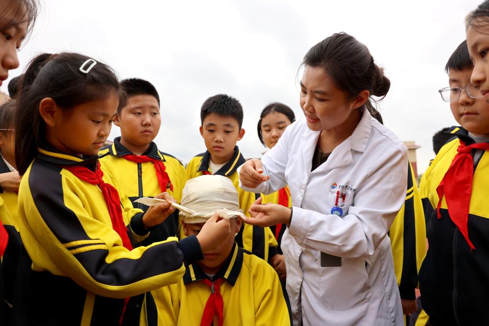 10月13日,山东省枣庄市市中区东湖小学学生在医务人员指导下学习应急包扎技能。