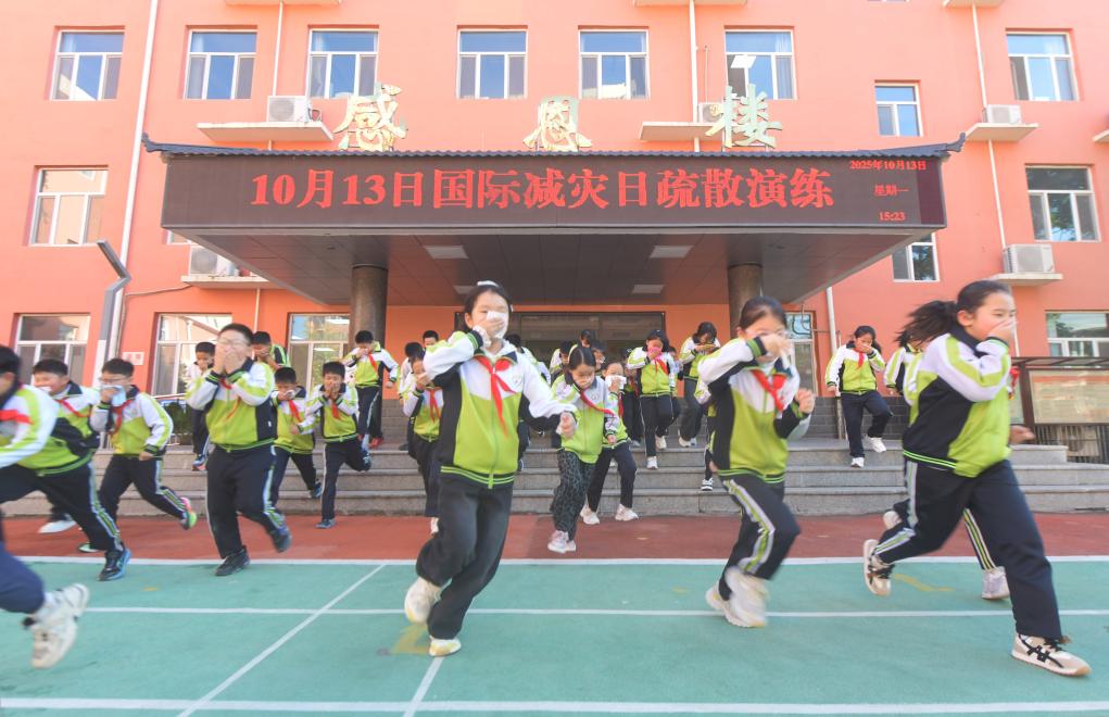 10月13日,河北省石家庄新乐市民生街小学学生在进行防震减灾疏散演练。