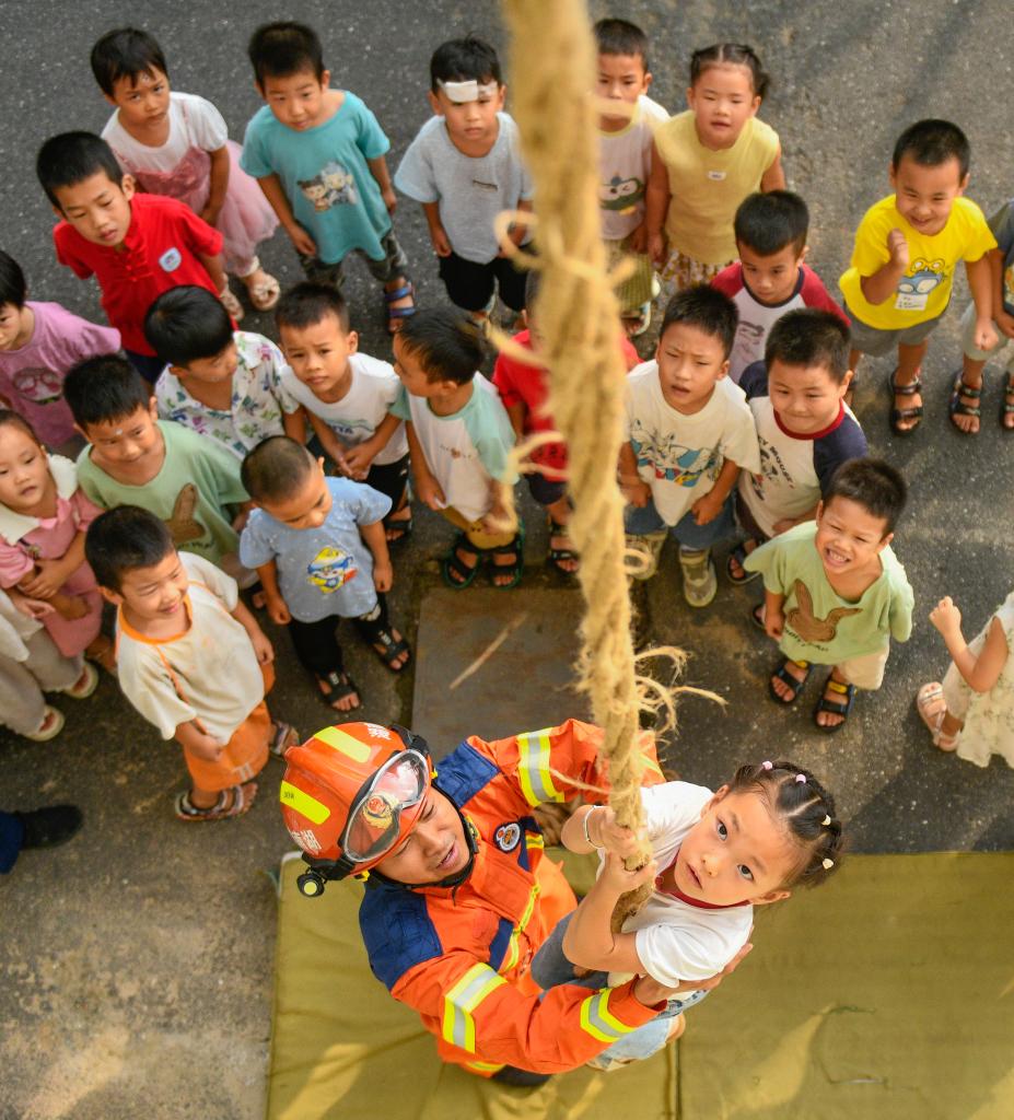 10月13日,小朋友在湖南省永州市道县消防救援大队消防救援人员的协助下体验绳索攀爬技能。