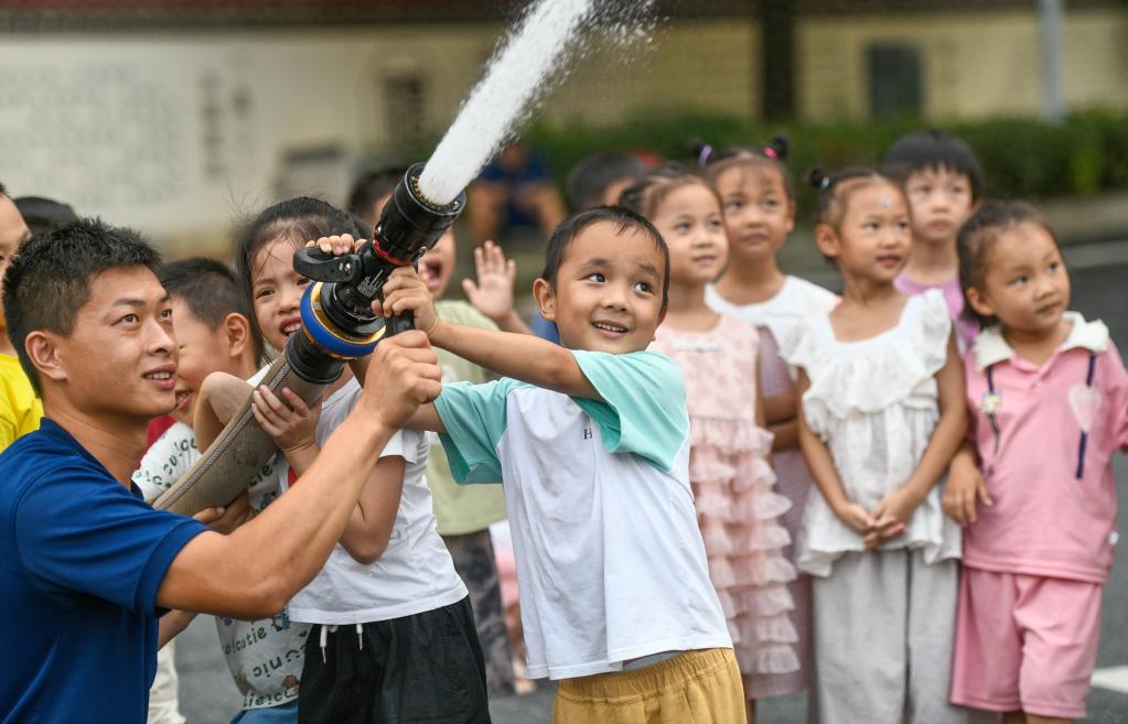 10月13日,小朋友在湖南省永州市道县消防救援大队消防救援人员的协助下体验使用消防水枪。