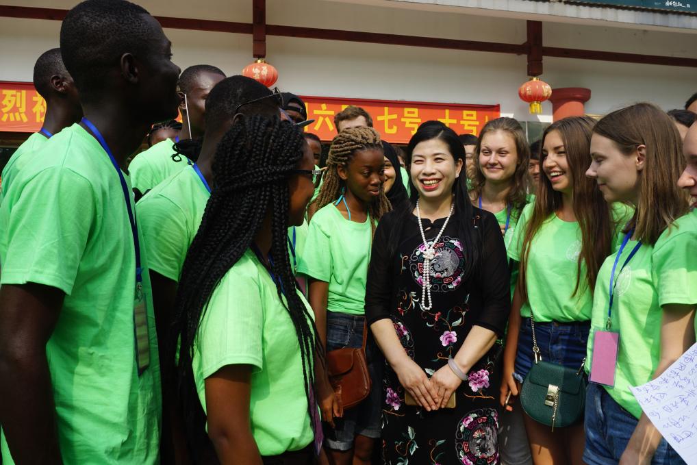 江再红(中)给外国留学生讲解湘绣知识(资料照片)。