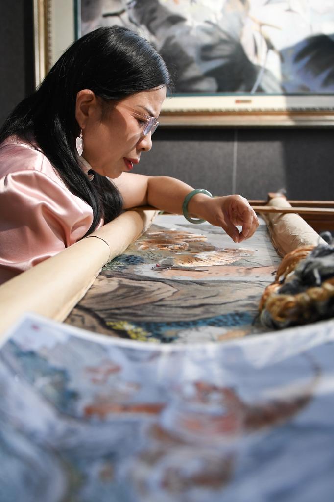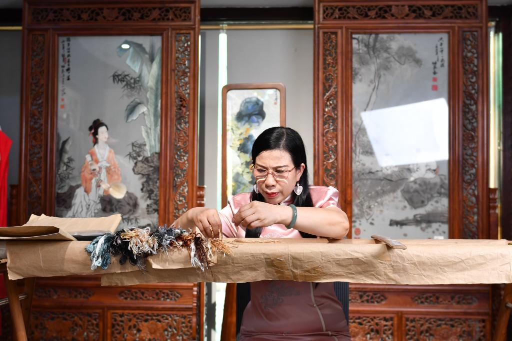 10月10日,江再红在长沙市湘绣研究所工作室制作湘绣作品。