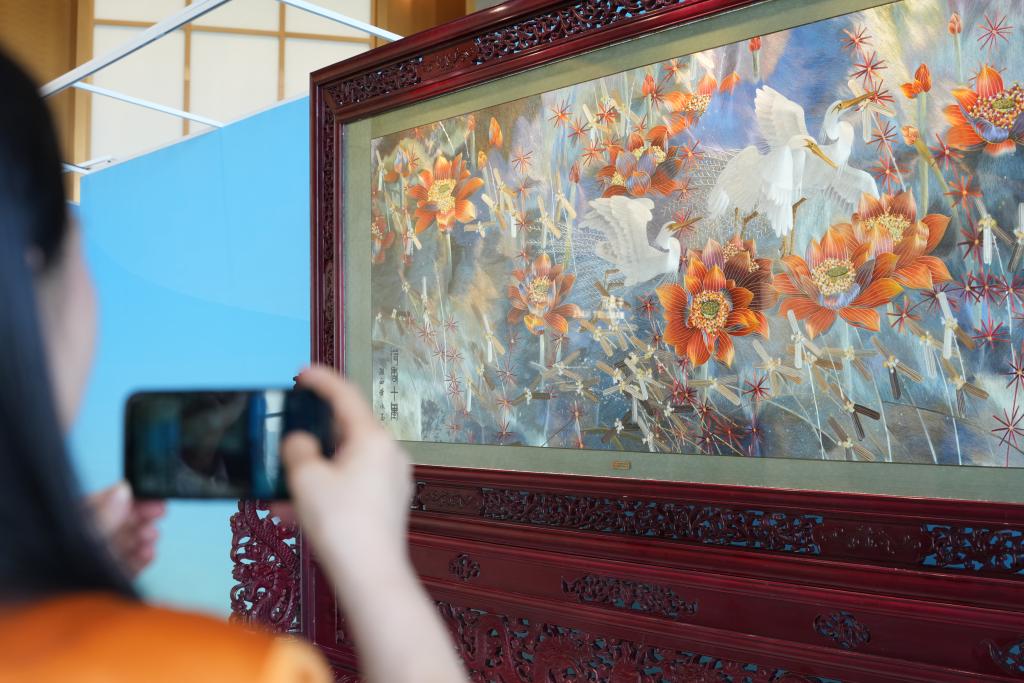 10月13日,江再红在北京举行的全球妇女峰会现场拍摄自己的湘绣作品。