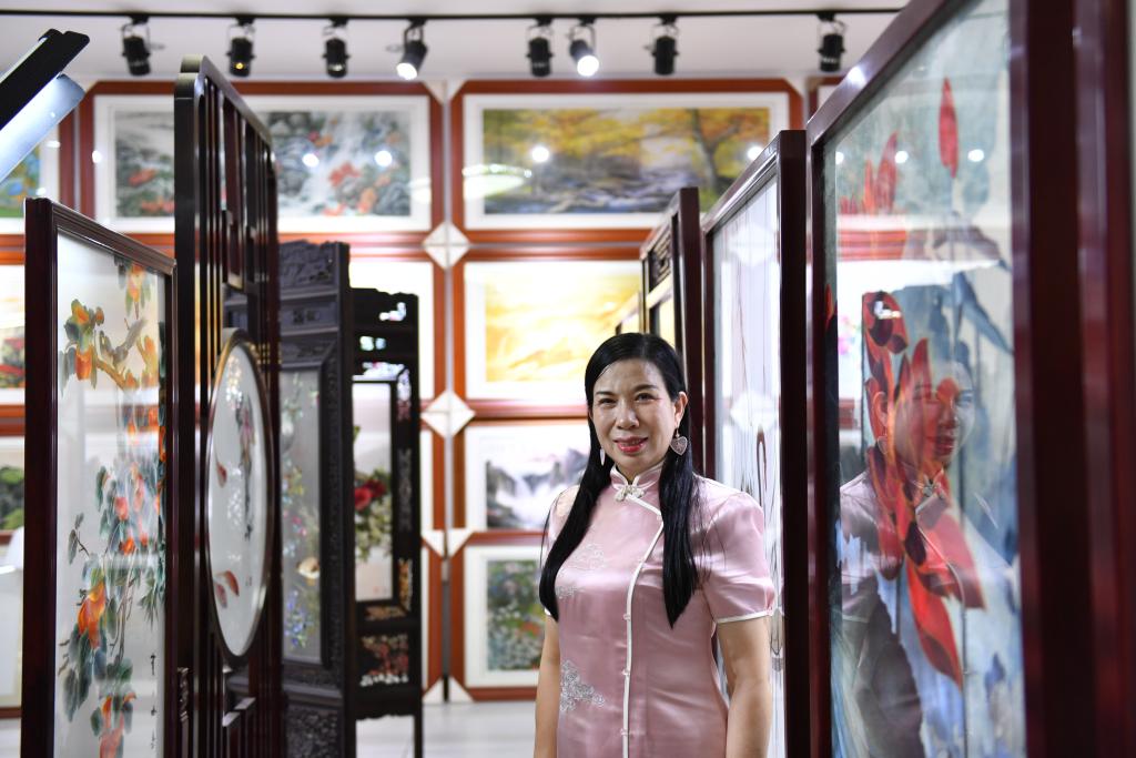 10月10日,江再红在长沙市湘绣研究所工作室和自己的湘绣作品合影。