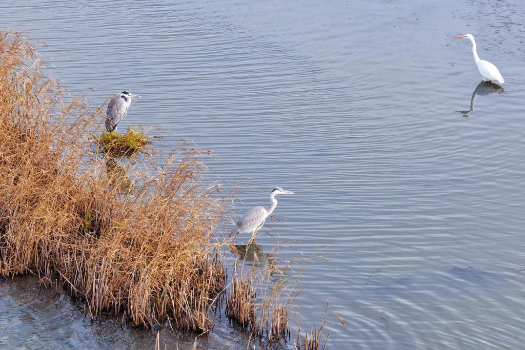 10月14日在黑龙江省同江市三江口国家湿地公园拍摄苍鹭和白鹭。