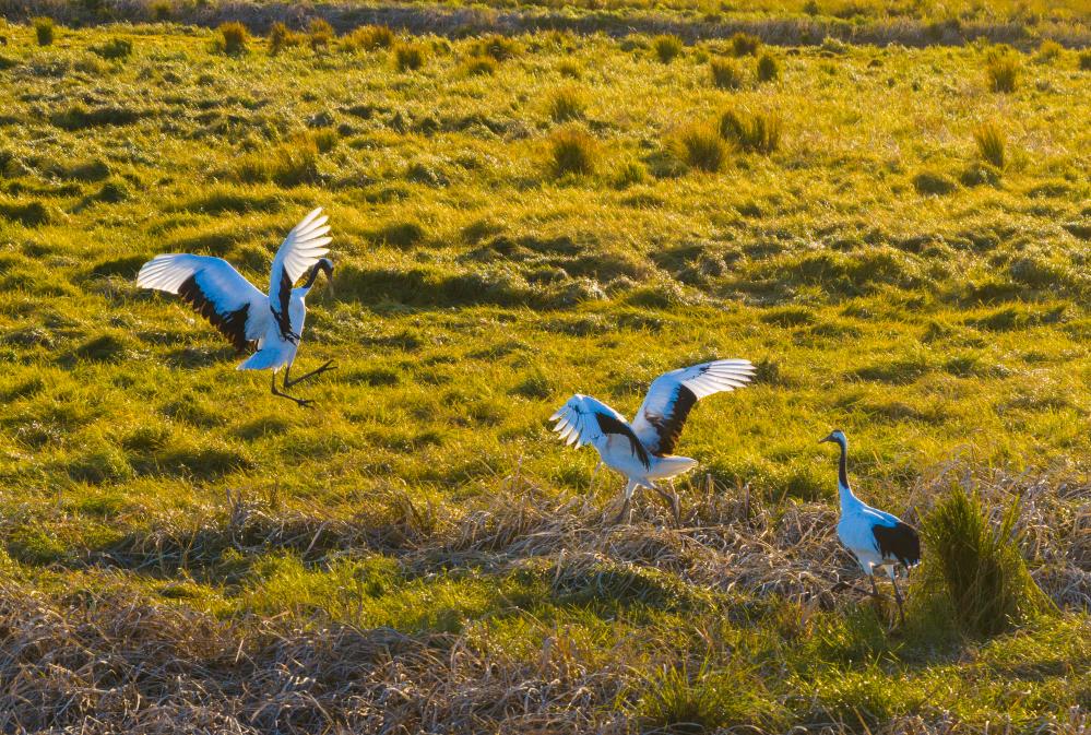 10月9日,在黑龙江挠力河国家级自然保护区,丹顶鹤在湿地中活动(无人机照片)。