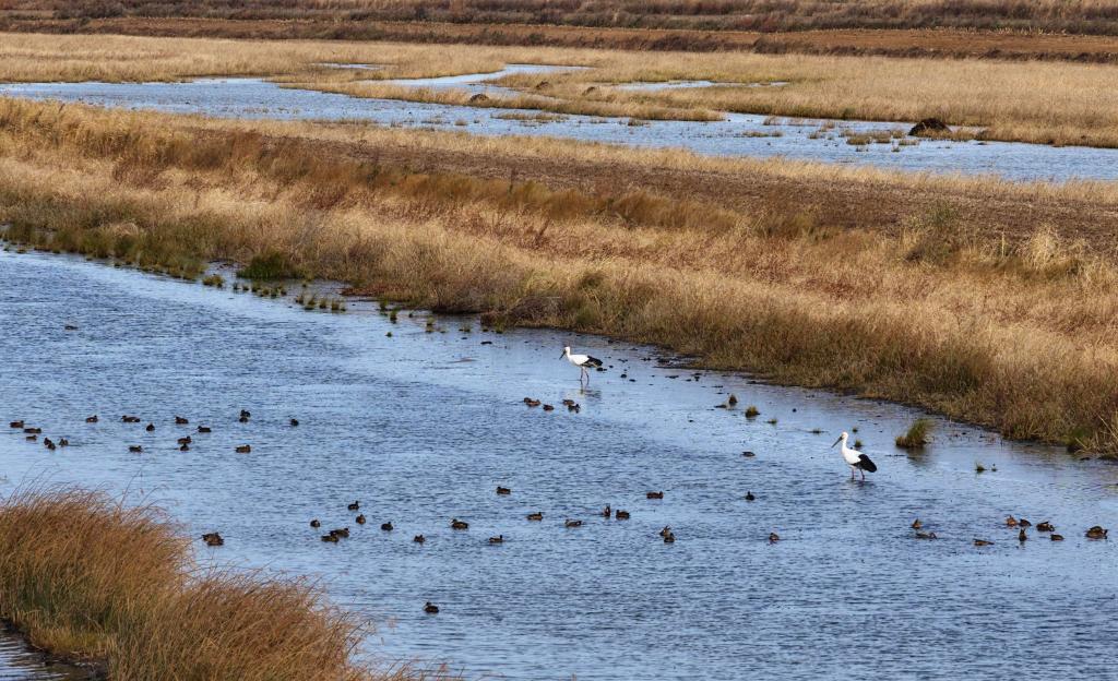 10月14日在黑龙江省同江市三江口国家湿地公园拍摄的东方白鹳和野鸭(无人机照片)。