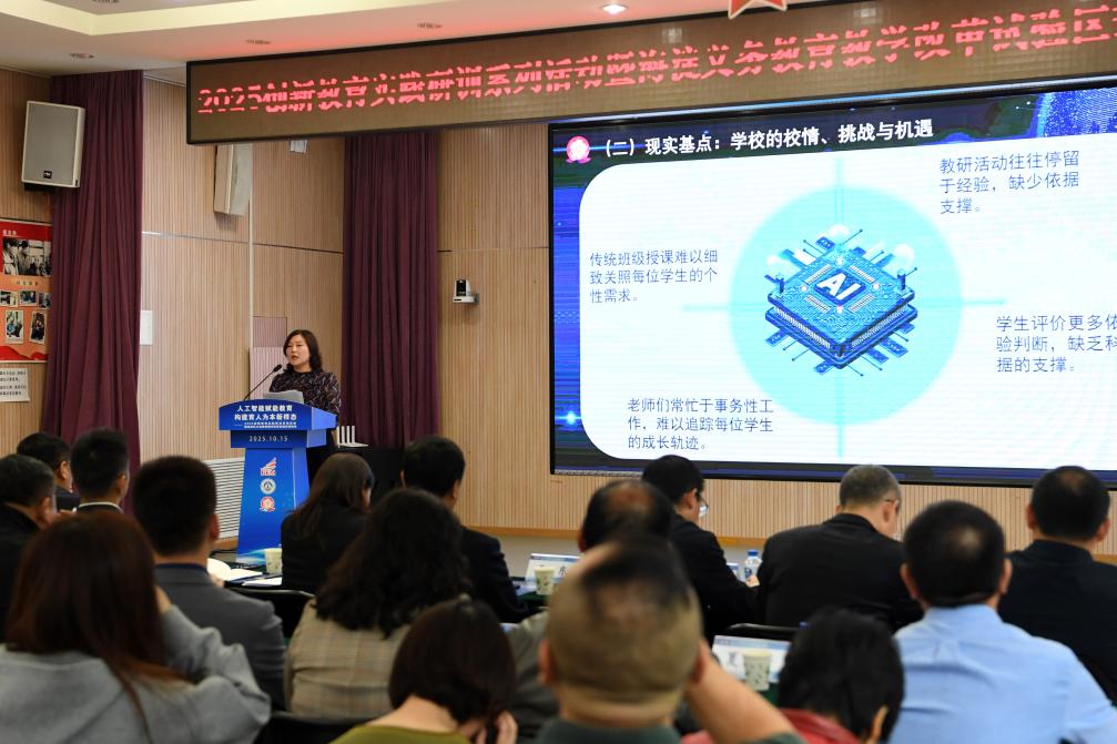 10月15日,北京市海淀区第四实验小学校长王亚苹进行主题发言,介绍学校将人工智能技术用于教学的经验。