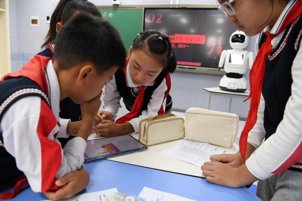 10月15日,在北京市海淀区第四实验小学《闪烁信号》主题人工智能公开课上,学生通过自己编写的程序向机器人发指令。