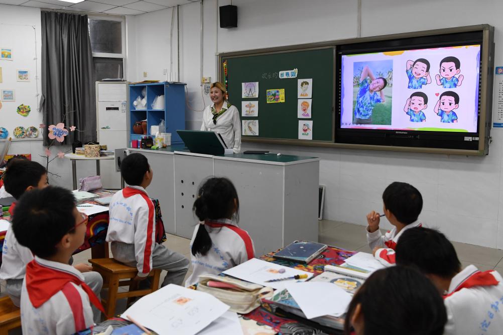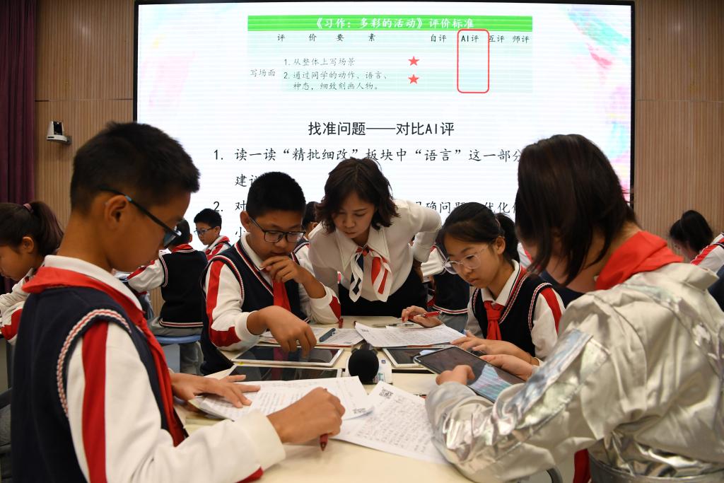 10月15日,在北京市海淀区第四实验小学《多彩的活动》主题语文公开课上,老师借助AI评改指导学生。