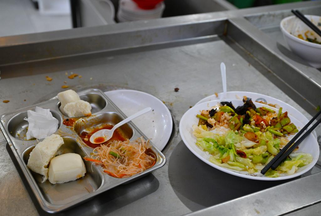 10月11日,在安徽某高校食堂,学生将未吃完的餐食放在餐盘回收区。