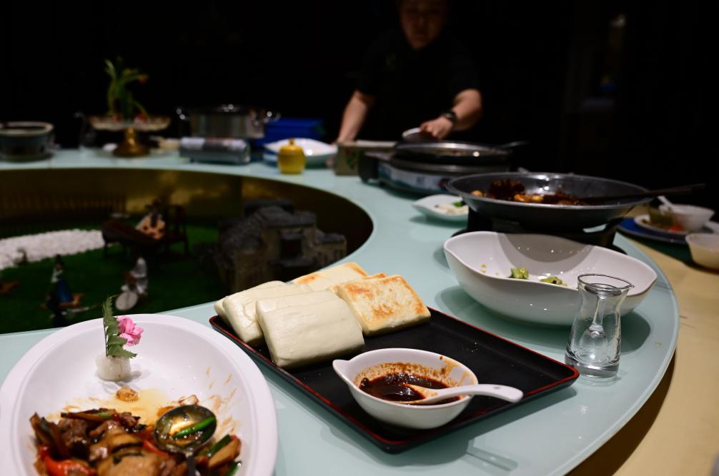 10月14日,在安徽合肥一家饭店内,服务员在顾客走后清理餐桌。桌上剩余的部分主食和菜品未被打包。