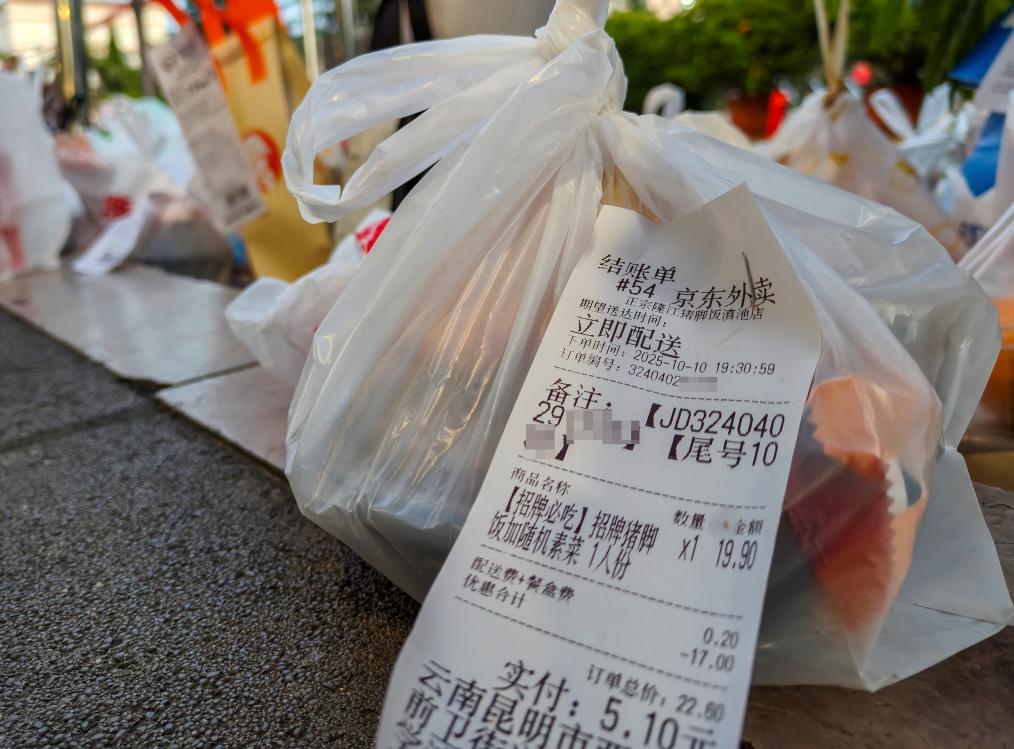 10月12日凌晨,在云南昆明某大学门口,外卖套餐中的部分小食、饮料被遗弃无人领取。