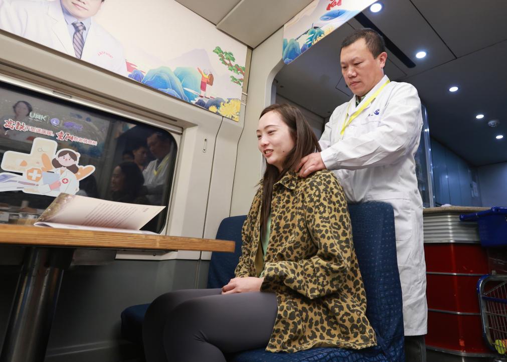 10月19日,在G8388次列车上,医生为旅客进行肩颈推拿。